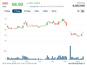 Cụ thể kết phiên 03/4, giá cổ phiếu DGC ở mức 56.500 đồng/cổ phiếu, tăng 4,63% so với phiên trước, khối lượng cổ phiếu giao dịch khớp lệnh đạt tăng đột biến gần 8,4 triệu đơn vị – tăng gần gấp đôi so với phiên trước, cho thấy lực cầu “bắt đáy” đang gia tăng rõ rệt.